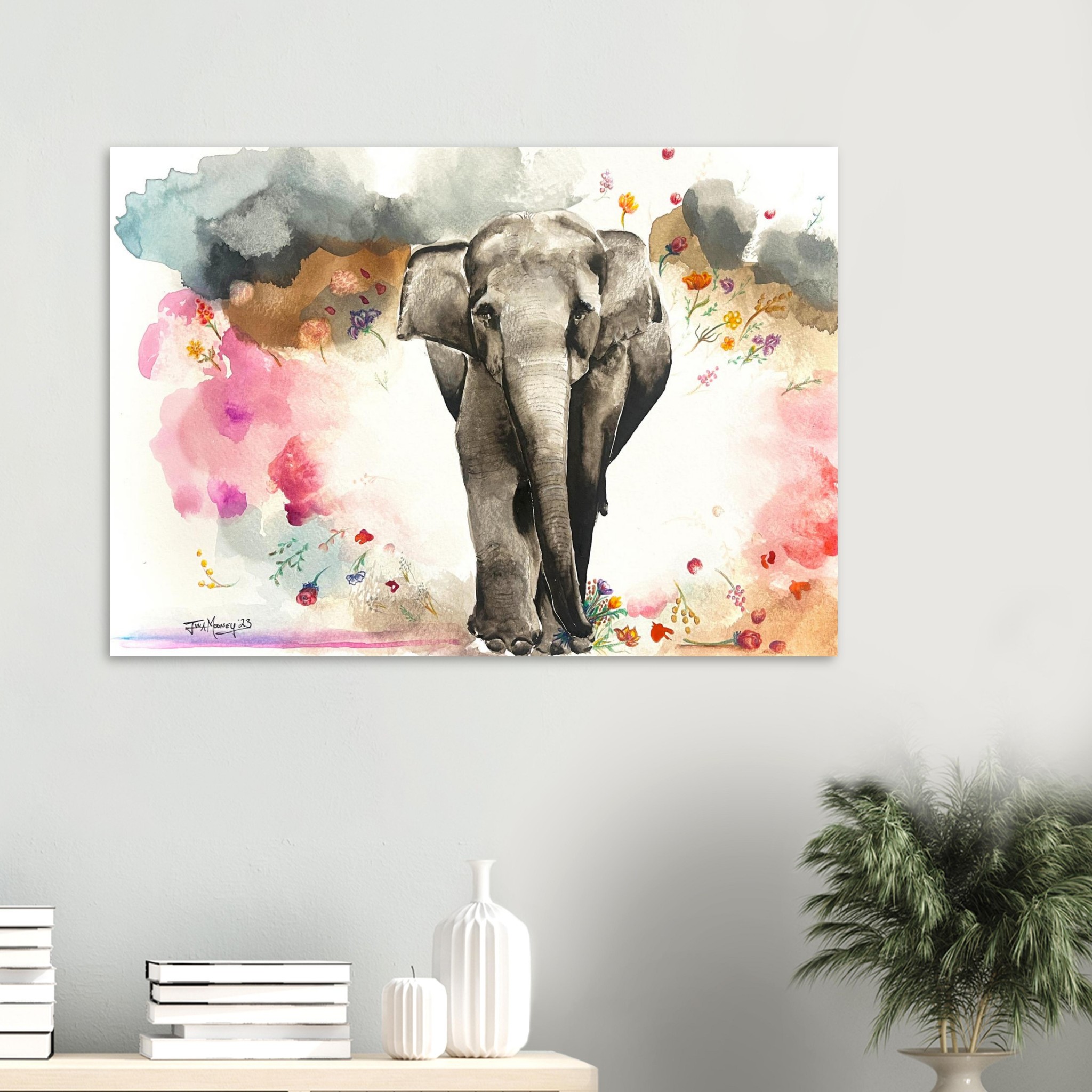Showcase this delightful watercolor elephant, as in emerges from a burst of colors, sprinkled with delicate floral accents. This painting translates beautifully as a museum quality giclée print and will look stunning framed in any space.