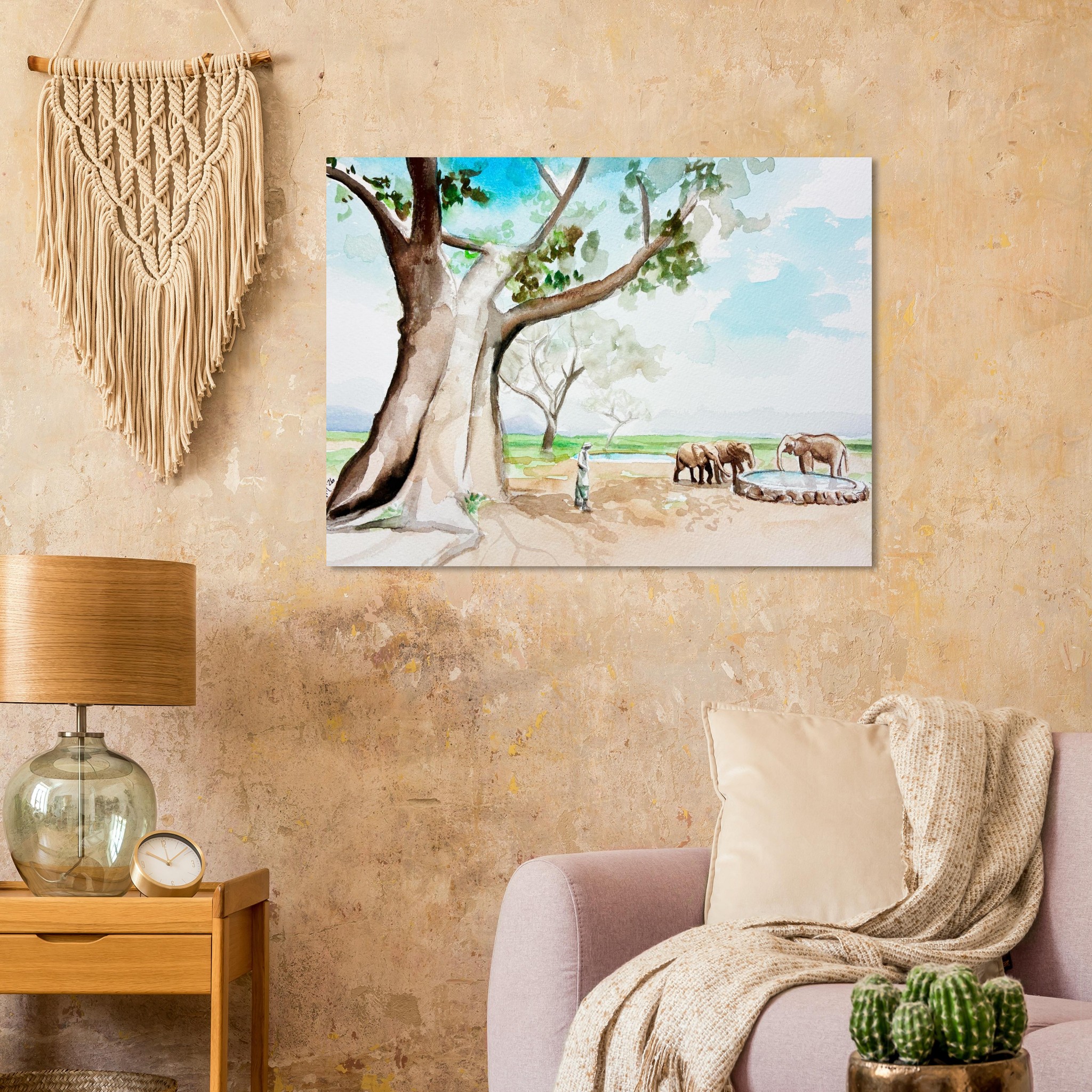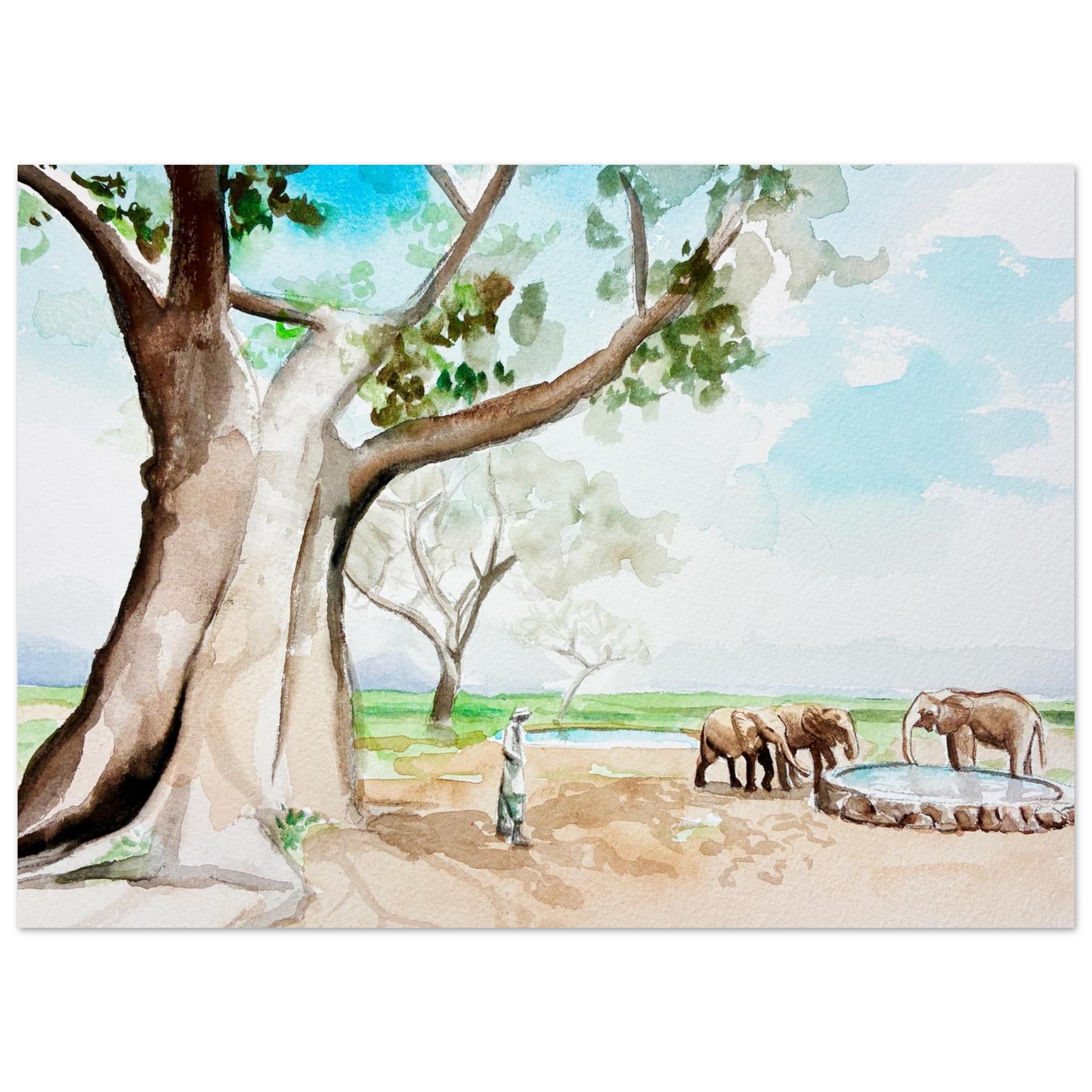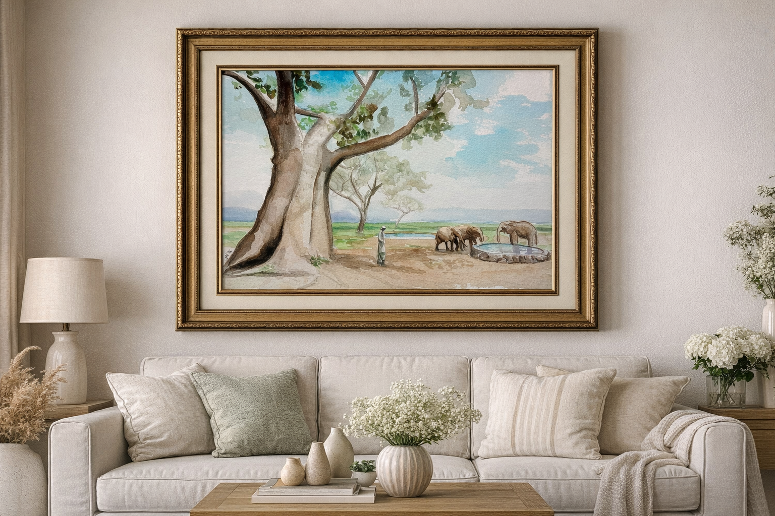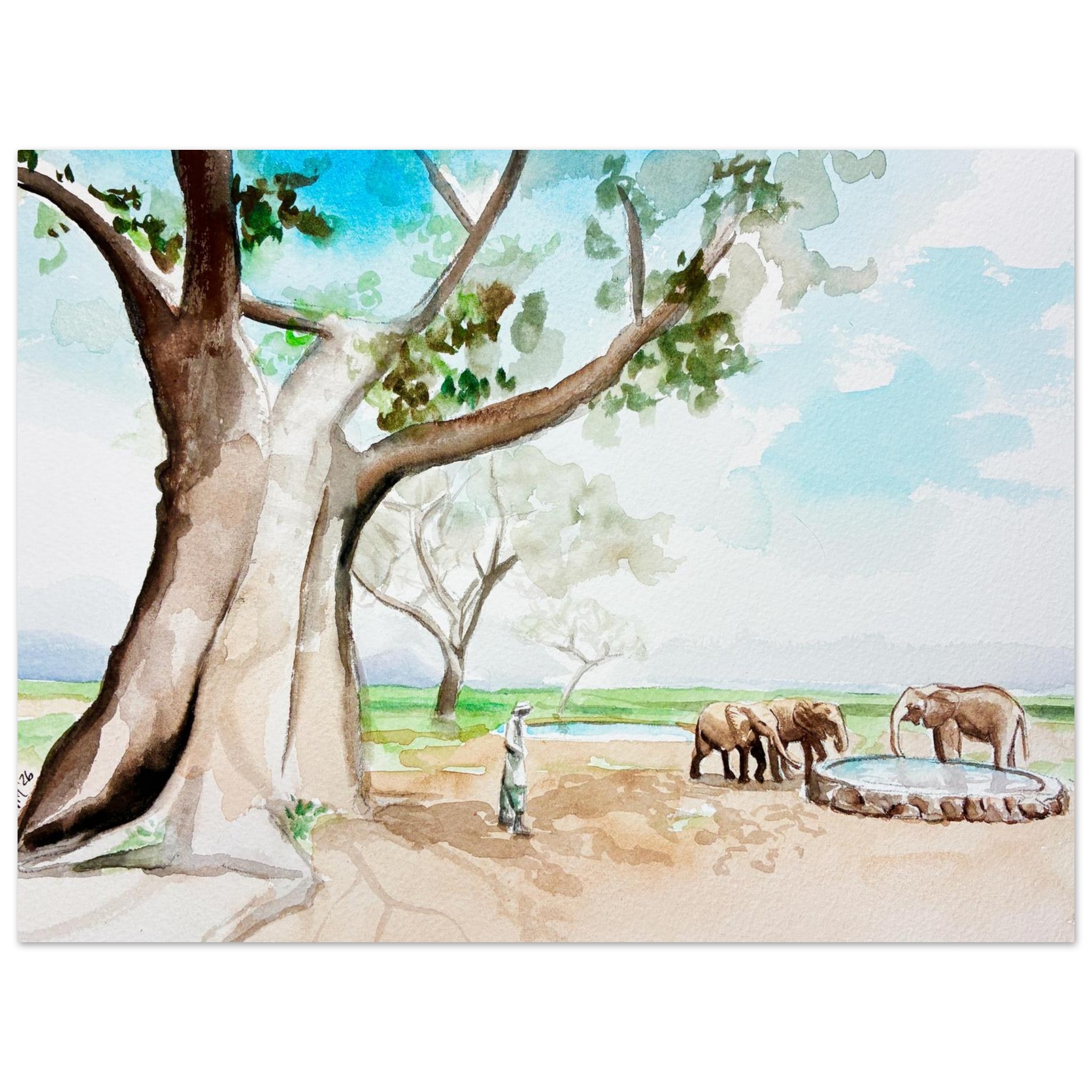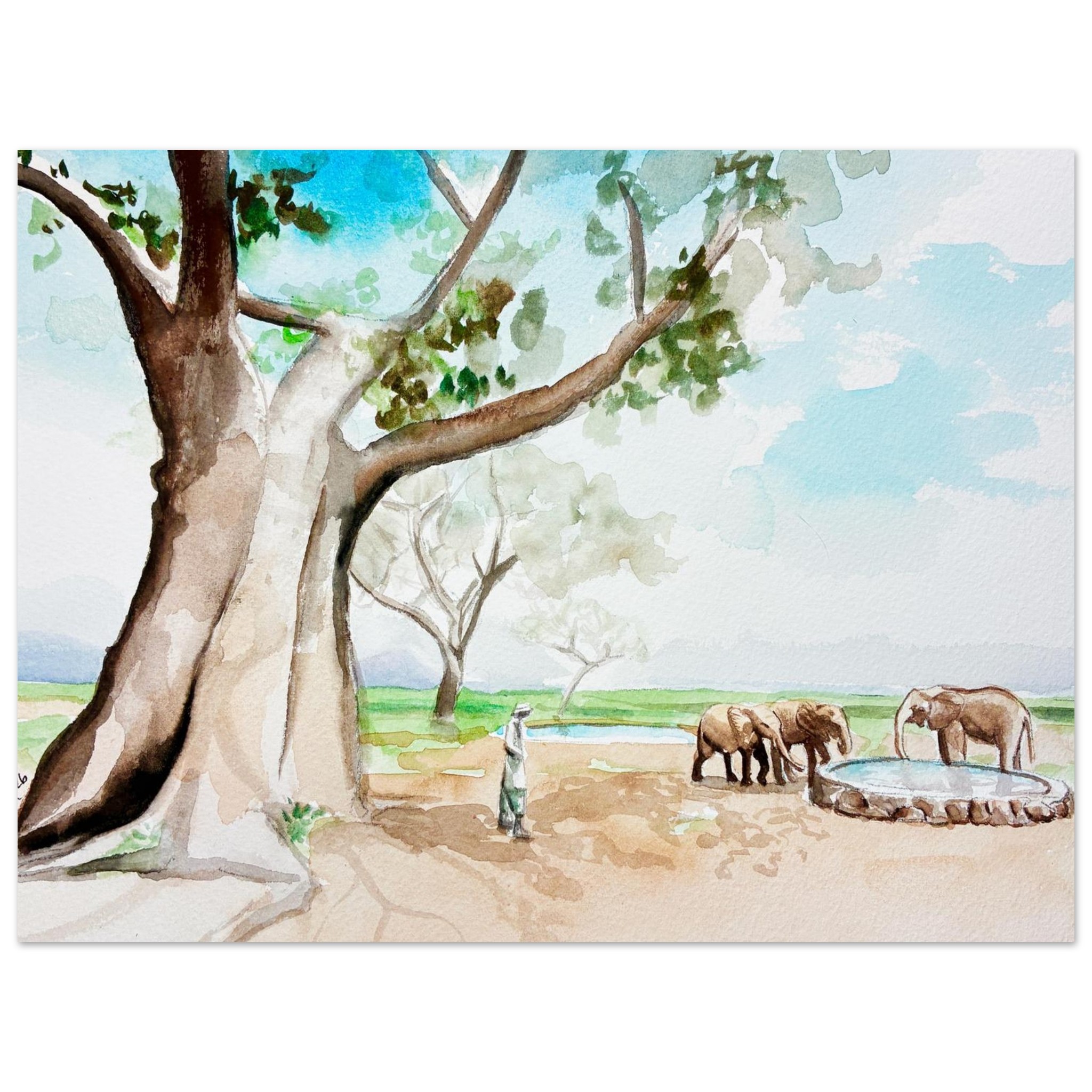 Add a subtle, exotic touch to any room with this original watercolor painting by Julia Ranson Mooney. Featuring African elephants drinking in the shade of a baobab tree in the savanna. Fun fact, the baobab tree can live for thousands of years, often featuring a bulbous swollen base like the one seen here!