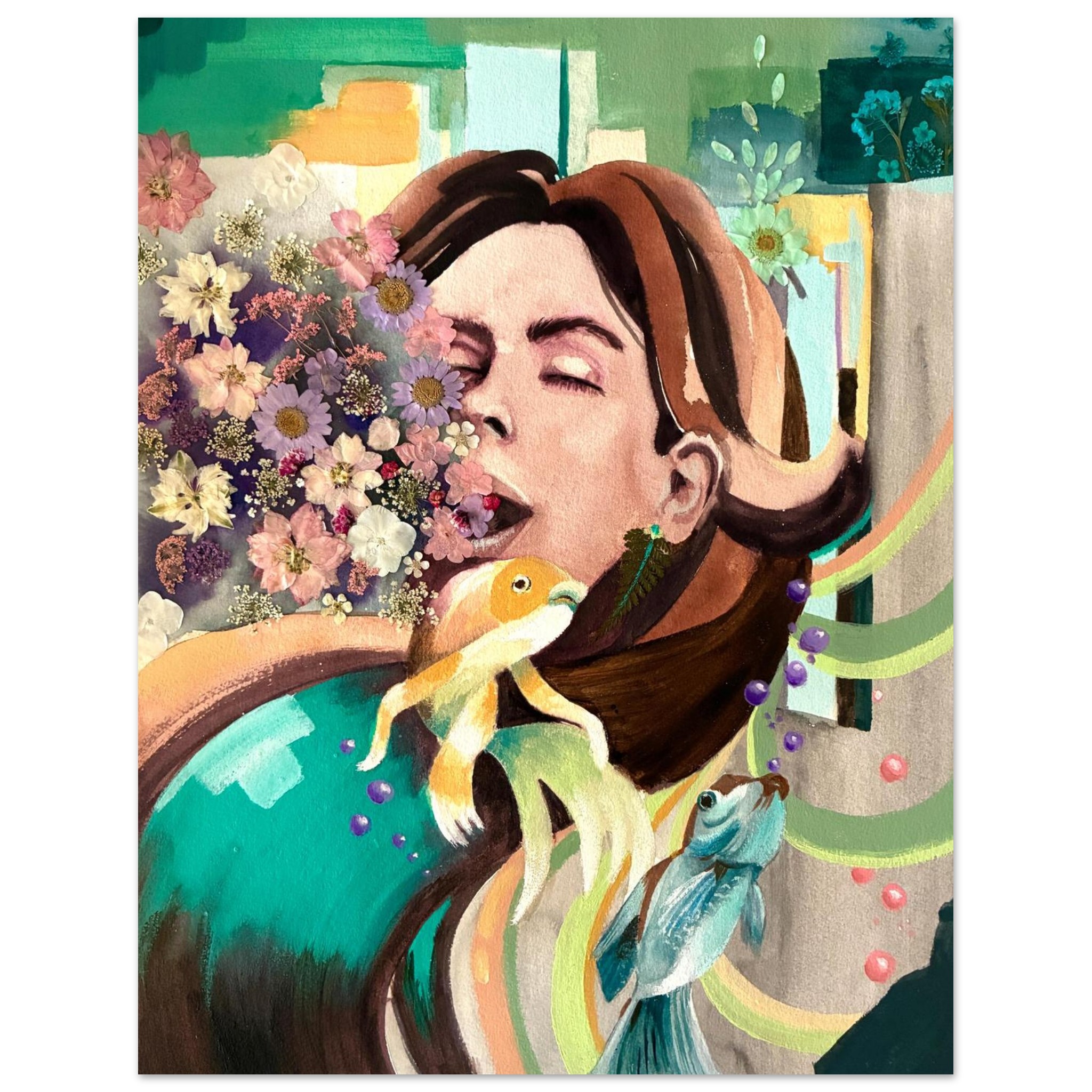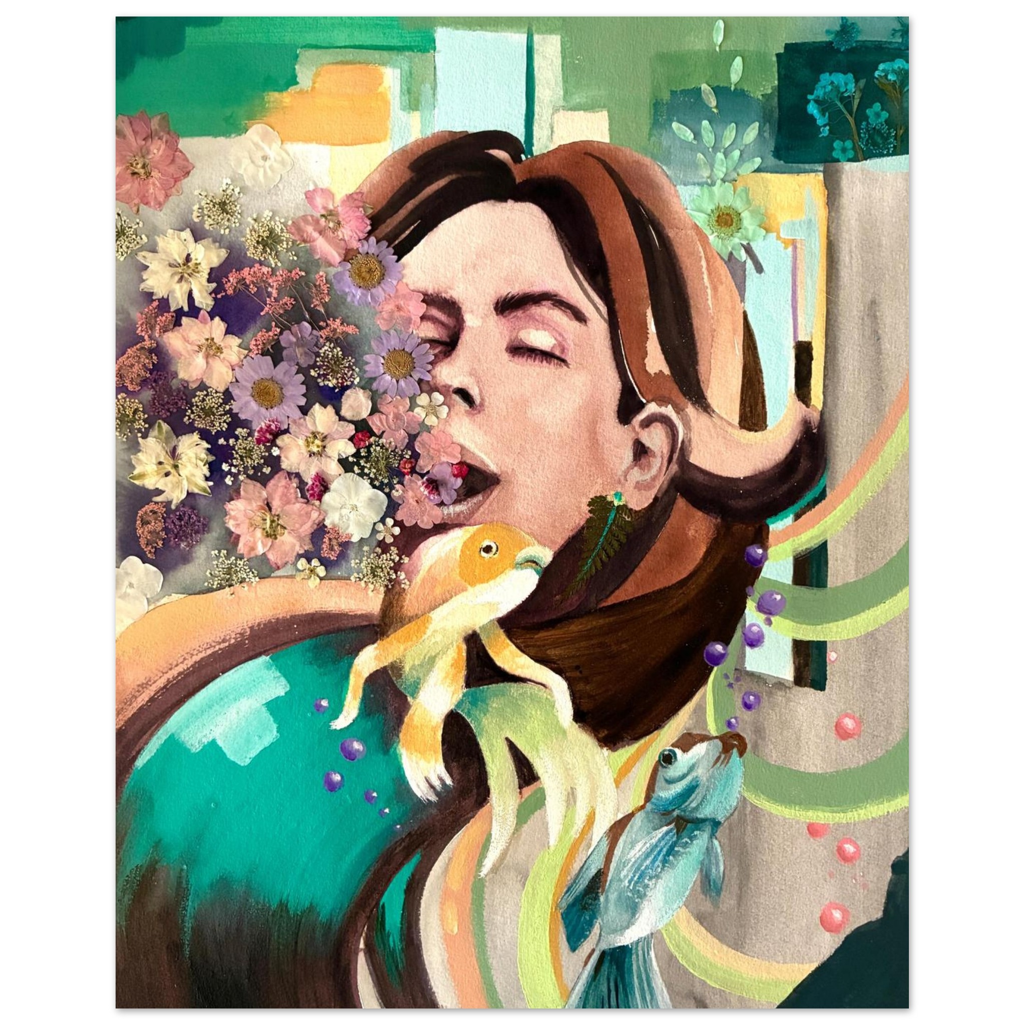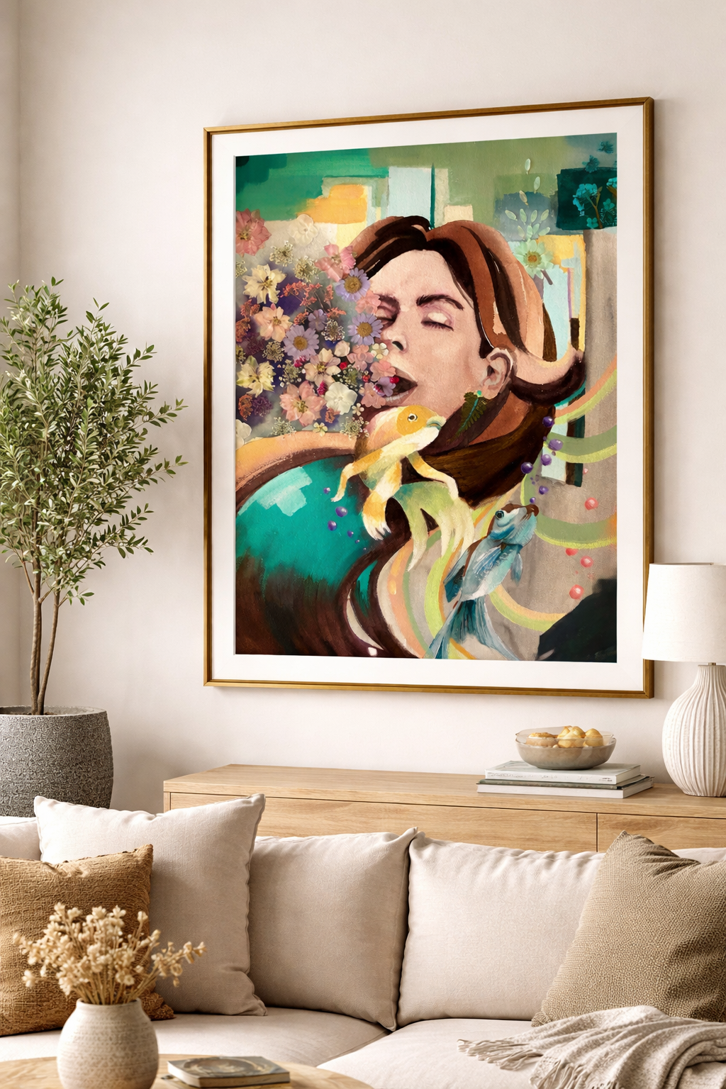 Captivate viewers with this show-stopping painting of a woman breathing florals into a surreal space. The perfectly balanced textures and colors create a masterful composition that blend muted greens and warm tones.