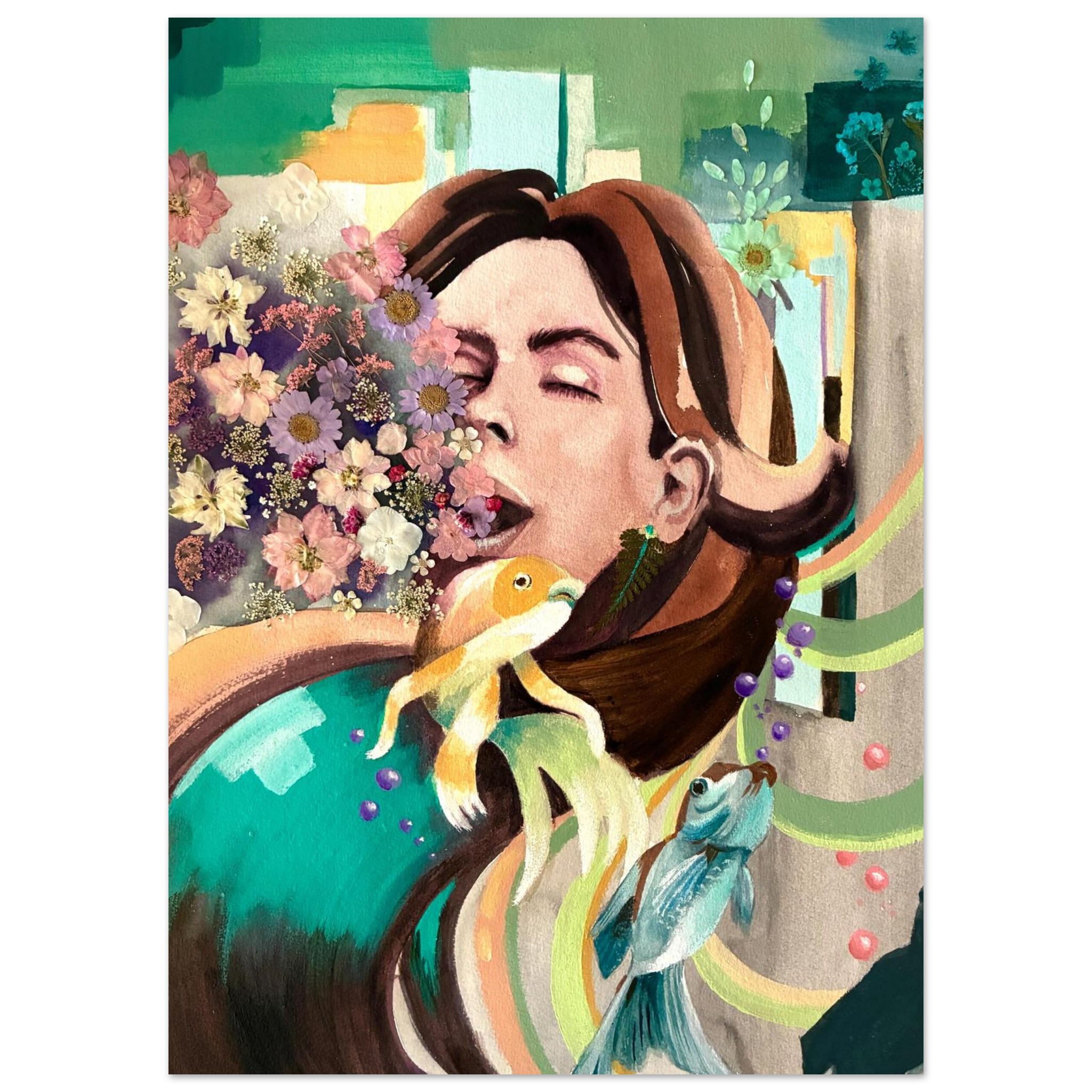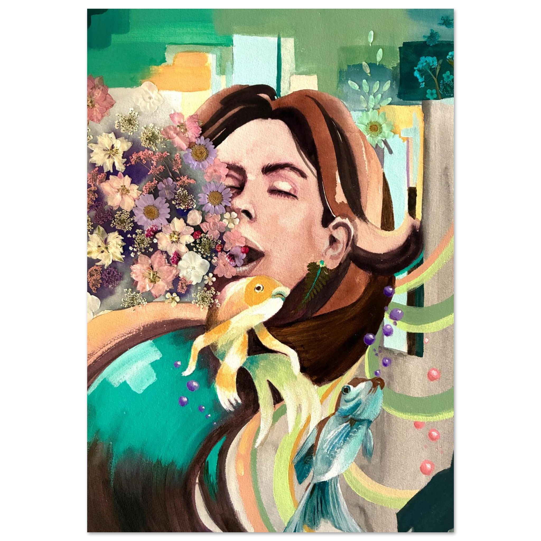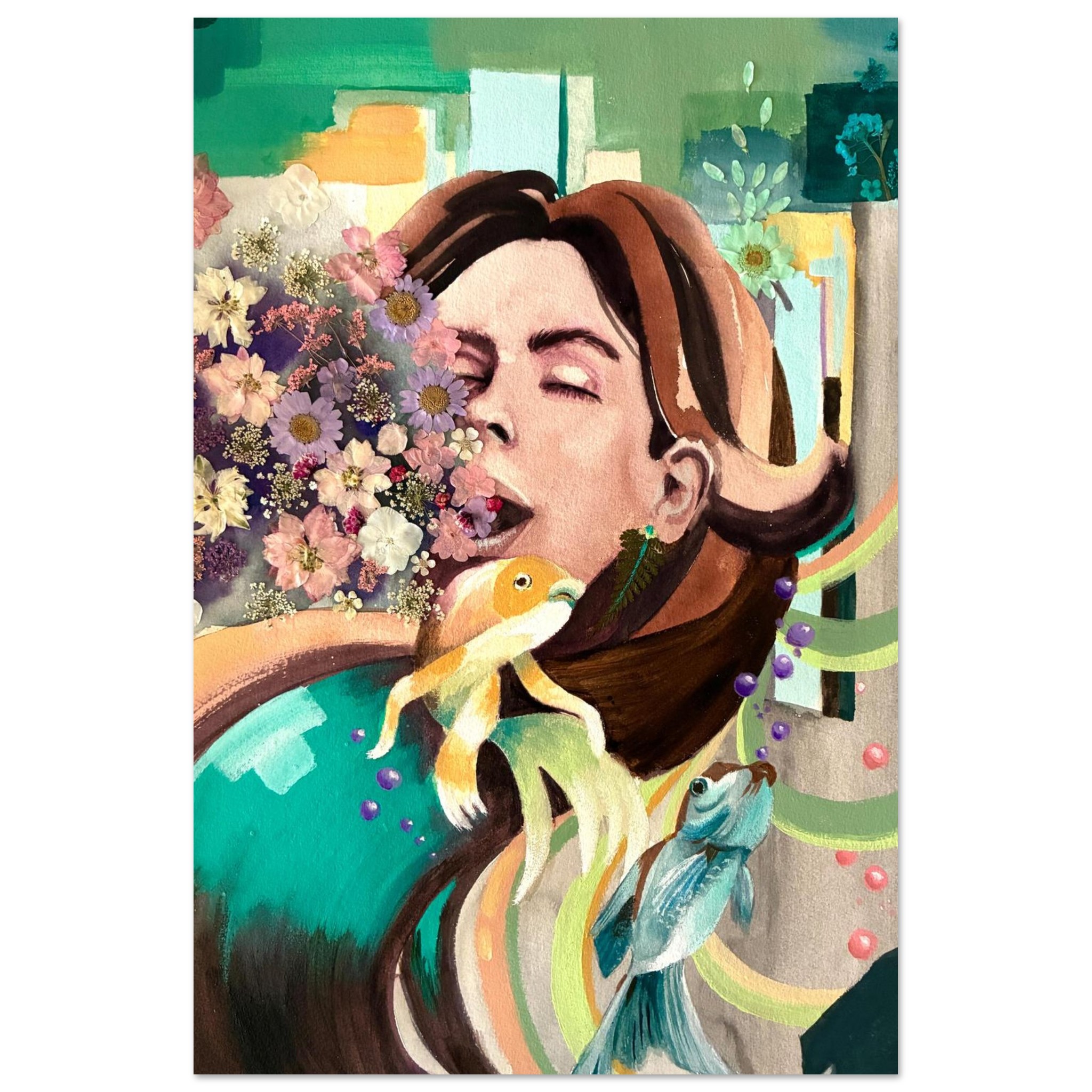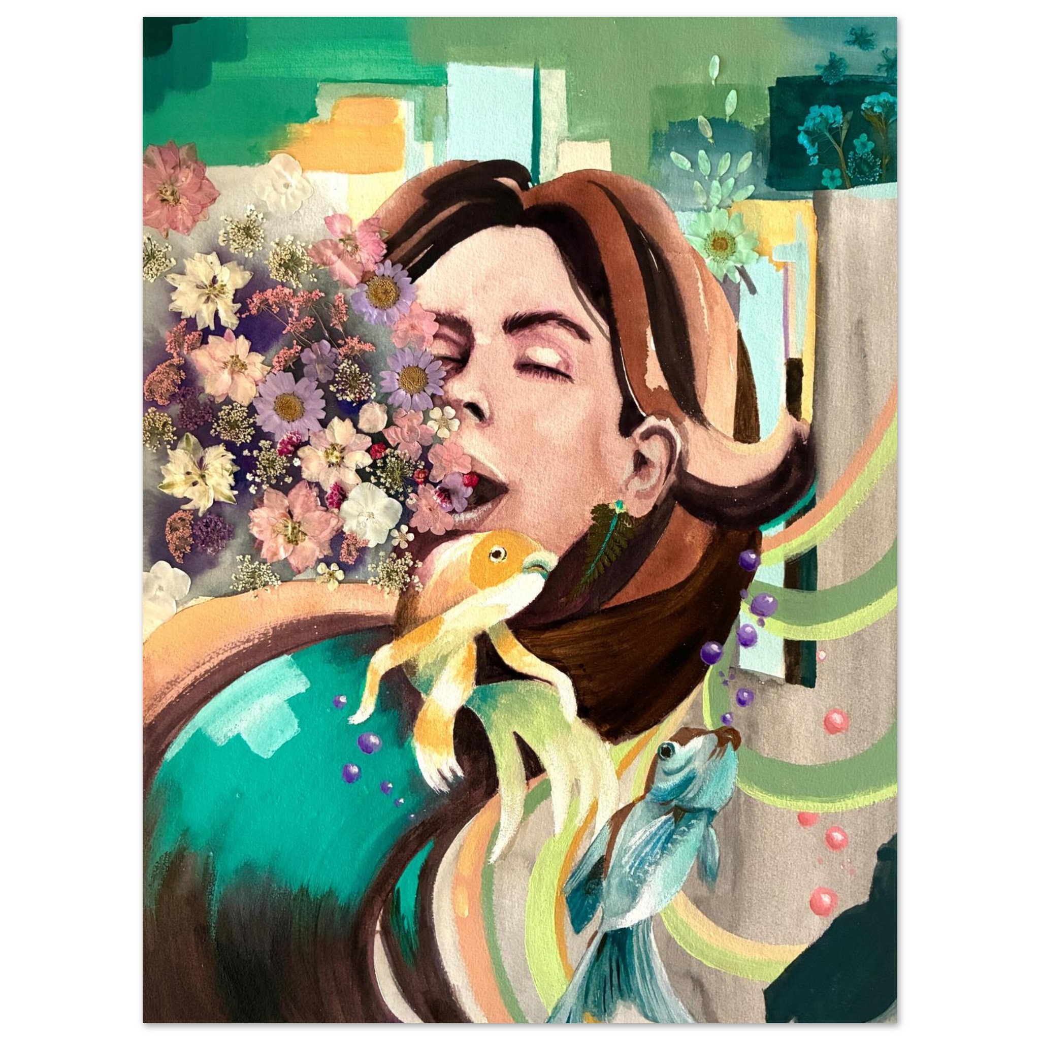 Captivate viewers with this show-stopping painting of a woman breathing florals into a surreal space. The perfectly balanced textures and colors create a masterful composition that blend muted greens and warm tones.
