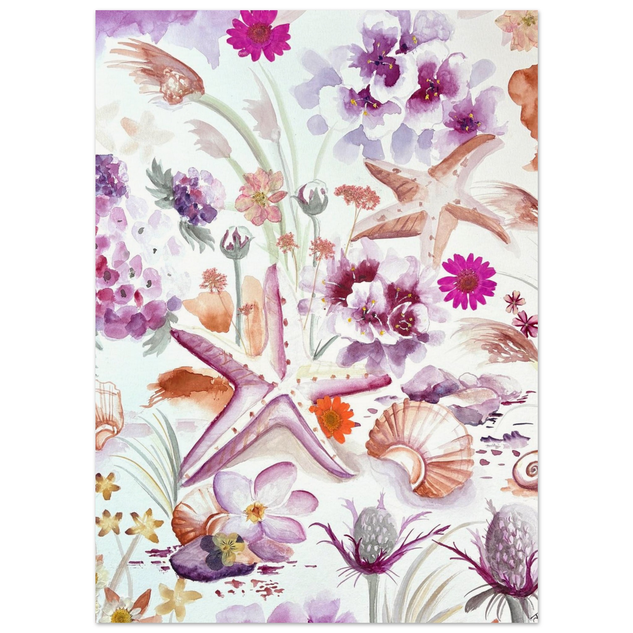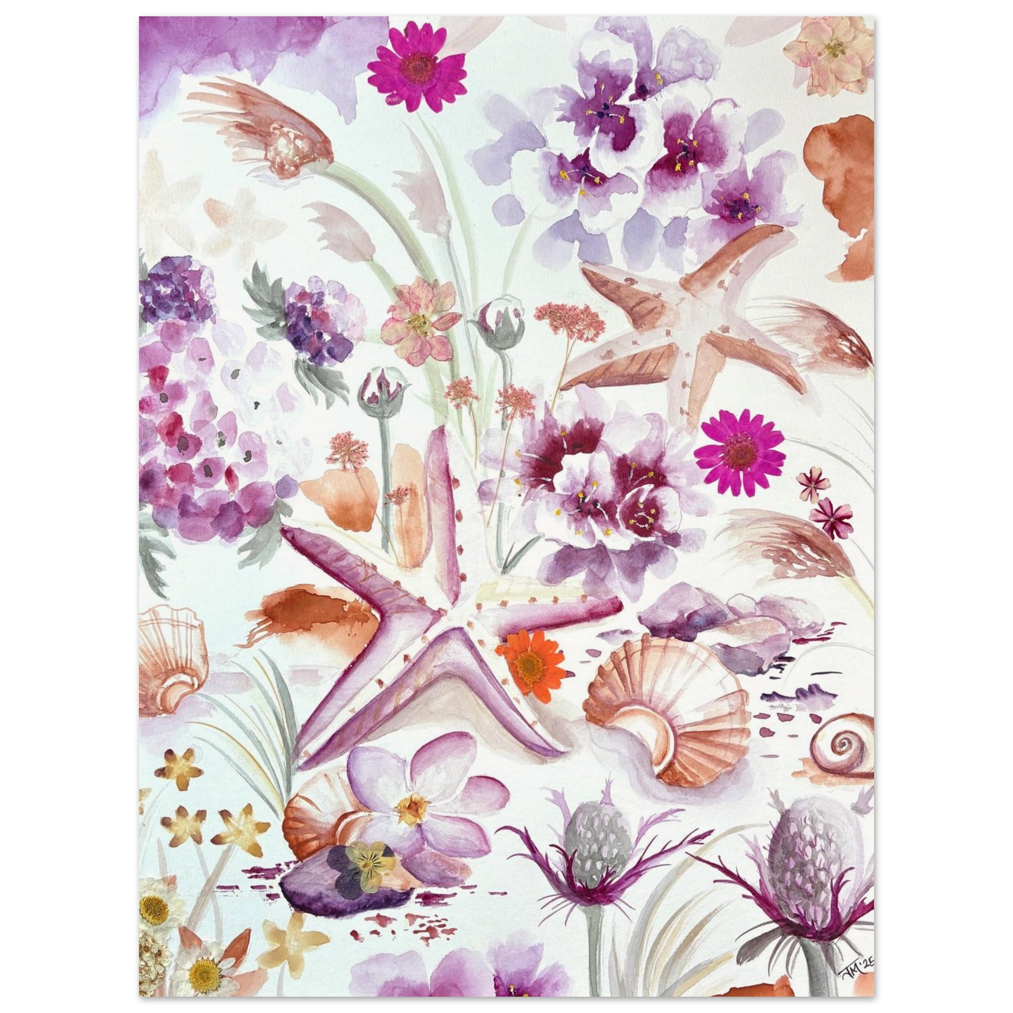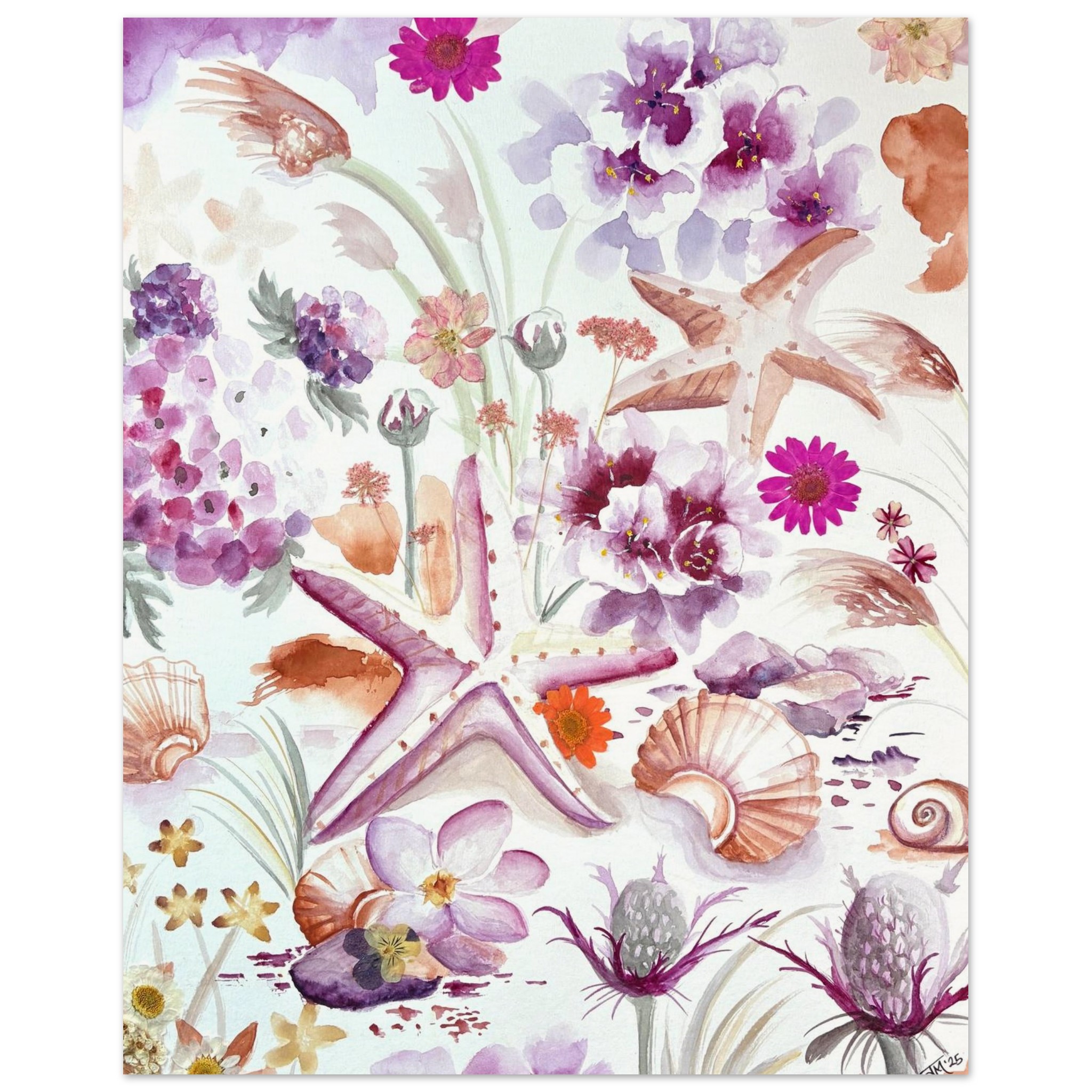 This original coastal painting by New Jersey artist Julia Ranson Mooney features softly rendered seashells, mingling with delicate beach vegetation and thistles. Expertly painted together in a pleasing composition of pinks, purples and sandy oranges, this piece will brighten up a shore house, office space, or serene bedroom wall.
