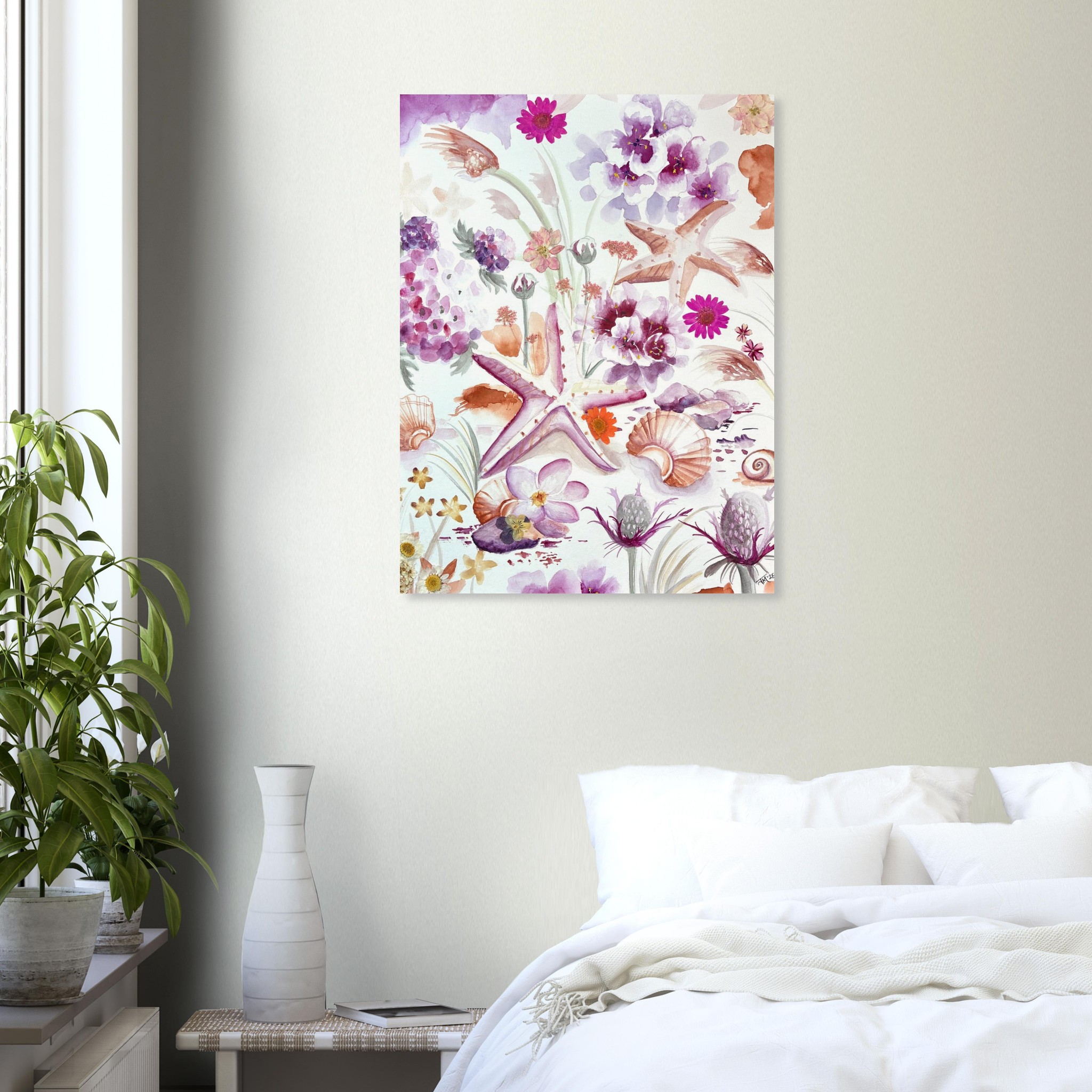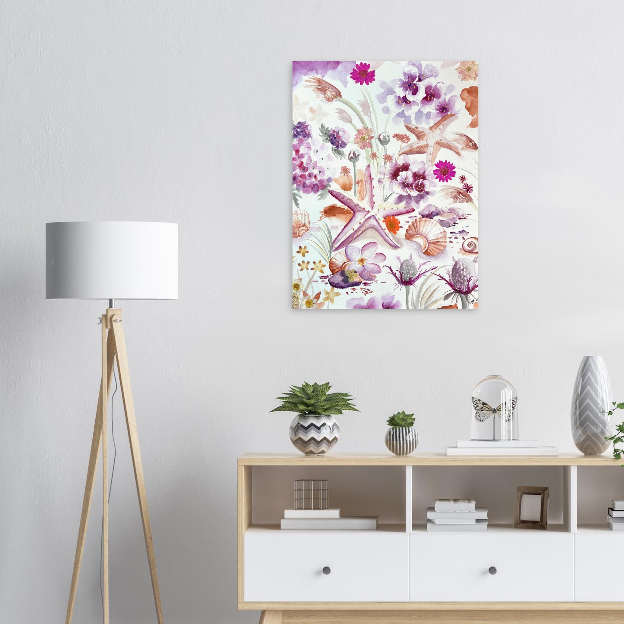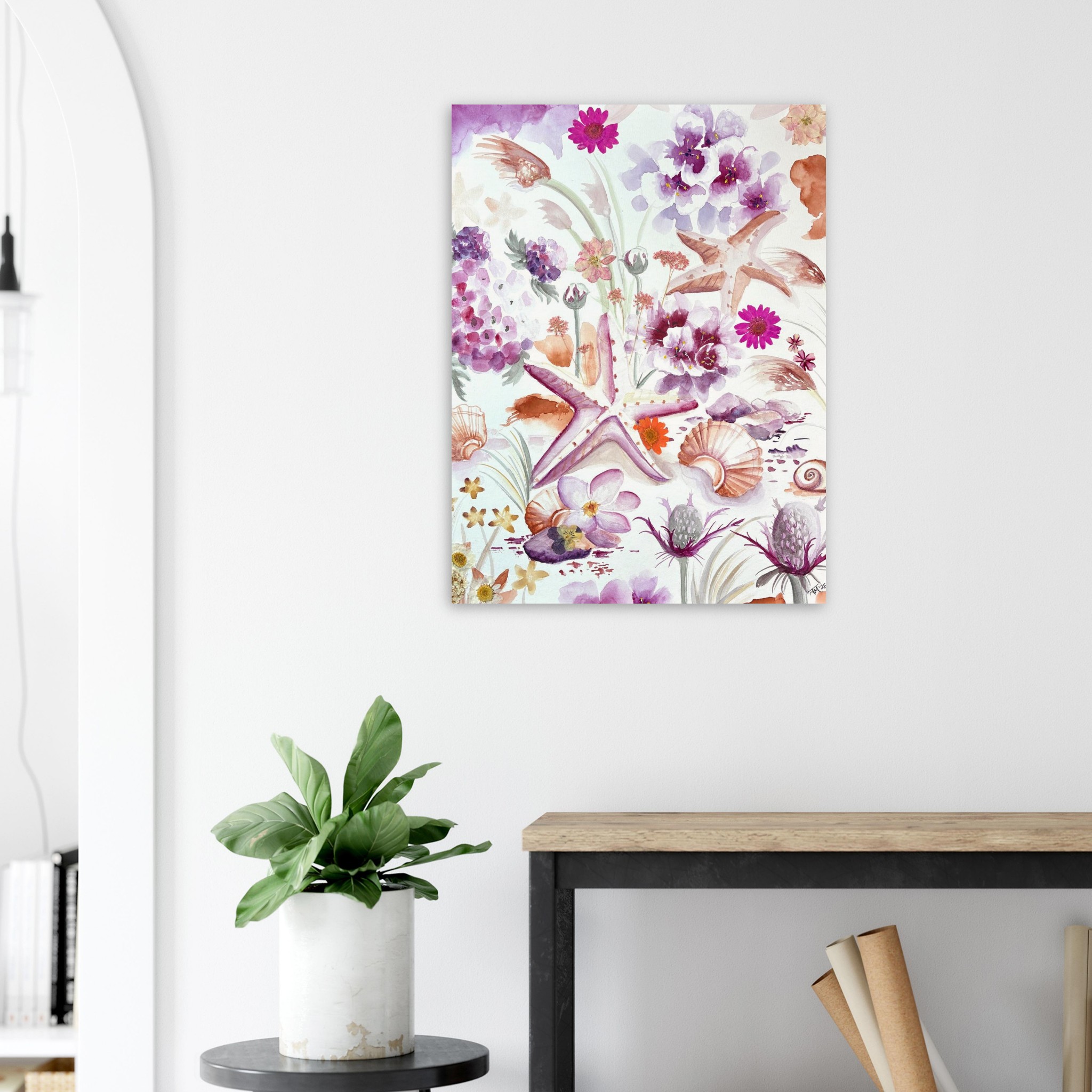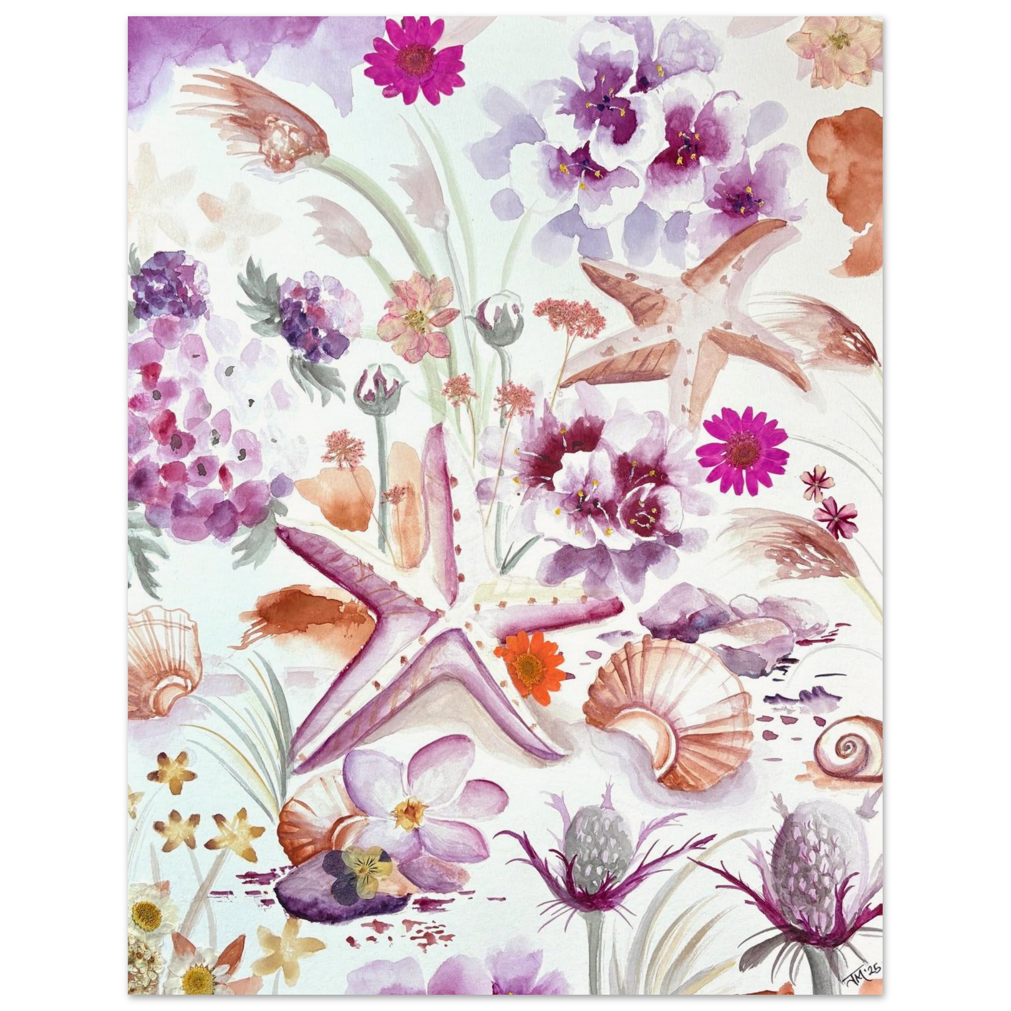 This original coastal painting by New Jersey artist Julia Ranson Mooney features softly rendered seashells, mingling with delicate beach vegetation and thistles. Expertly painted together in a pleasing composition of pinks, purples and sandy oranges, this piece will brighten up a shore house, office space, or serene bedroom wall.